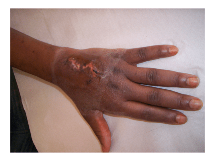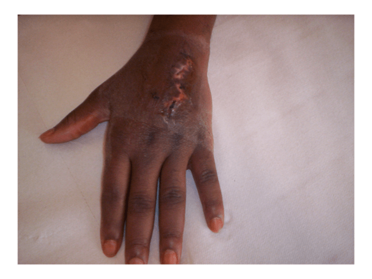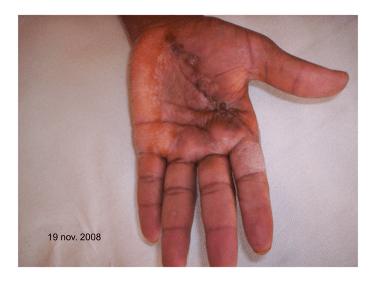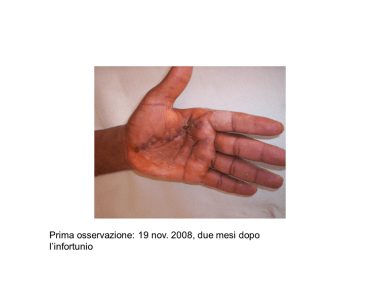 Nel settembre 2008 aveva riportato ustioni da plastica fusa: per rottura di un tubo, il getto di poliuretano termoplastico (punto di rammollimento del prodotto a temperatura superiore ai 120°C) gli era schizzato a pressione sul palmo della mano sinistra. Considerando la dinamica dell’incidente, tutto sommato era anche andata bene, la lesione era molto limitata. Dopo due mesi, però, non era guarita. La mano si presentava edematosa e rigida, con la cicatrice sulla superficie palmare a rilievi irregolari, lobulati, duri e dolenti alla palpazione