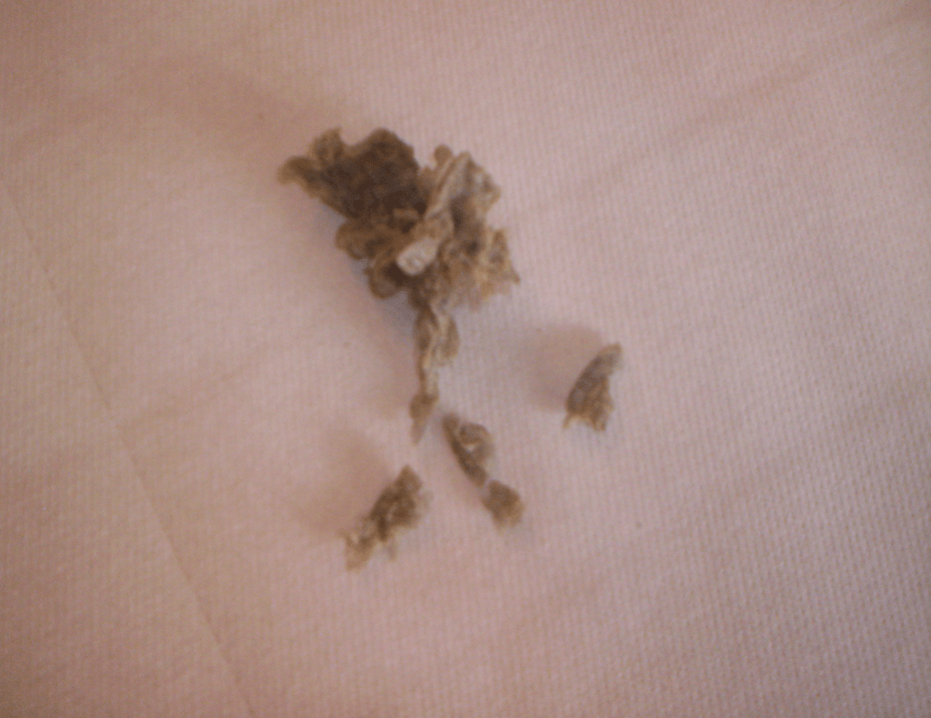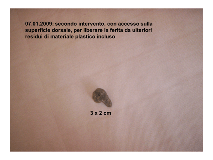 Il paziente veniva quindi sottoposto a toilette chirurgica della ferita… e dal fondo emergevano e venivano asportate una serie di masserelle solide e leggere, dall’aspetto resinoso, traslucido: la maggiore di circa 6 cm x 4, a forma irregolare, arborescente; altri tre frammenti più piccoli, variamente cilindro-conici, di 1 – 2 cm.