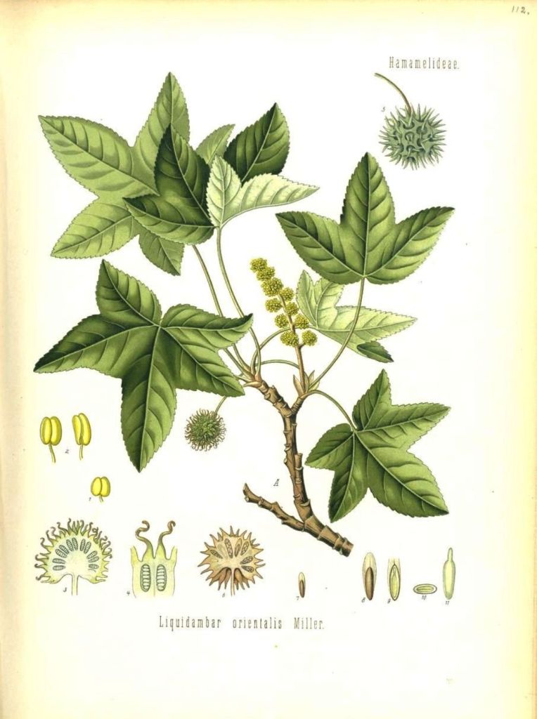 Il Liquidambar è un bell’albero con le foglie simili a quelle dell’acero, e già il nome, da liquidus e ambar (ambra in arabo) è indicativo delle sue proprietà, note fin dai tempi più lontani, con riferimento alla resina profumata che se ne ricava e ancor oggi reperibile nei mercati greci e turchi con il nome di storace. Ma il nome antico era Styrax, e così il dottor Simon chiamò styrol quella sostanza oleosa e Styroloxyd quella specie di gelatina che ne era progressivamente derivata lasciandola esposta all’aria per qualche giorno.
